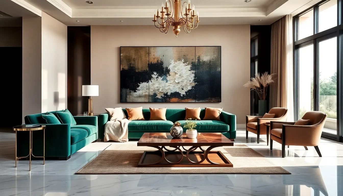 elegant luxury living room with stylish decor and natural light.